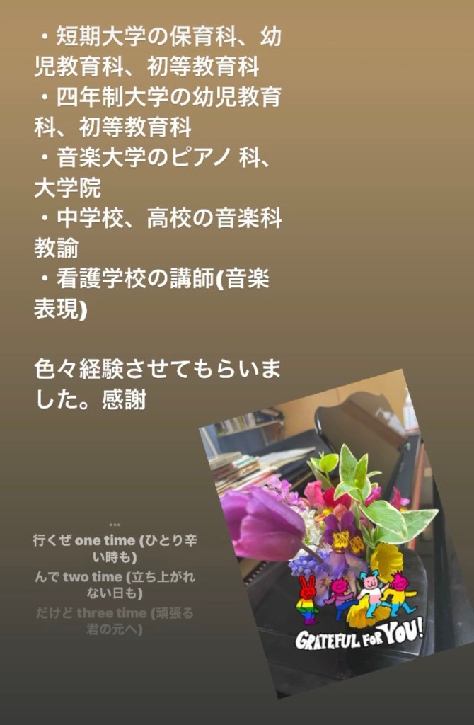 Currently he is a teacher chief of music department of Baiko junior high school high school,And a Visiting Professor of Baiko University, a part-time lecturer of Elisabeth University of Music, a lecturer of Hagi Nursing School, a lecturer of Tokuyama Nursing College. There he is working on a new music education using the Creative Drama method.